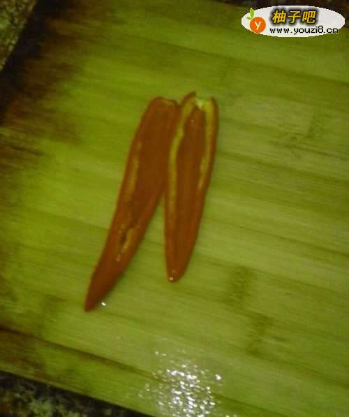 把材料准备好,红豆角、辣椒洗干净,红辣椒对半切开,把里面的籽去掉,这样就不会很辣了。如下图所示。