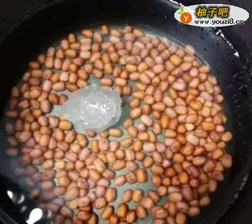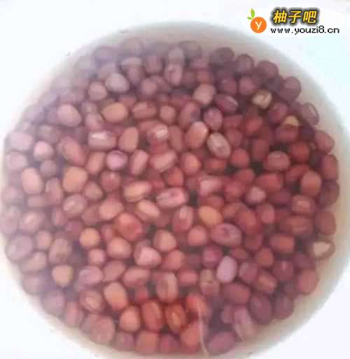 2把红豆倒入锅里,加入冰糖,320毫升的清水,把红豆煮熟透了。