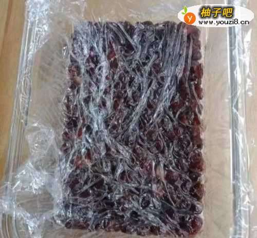 5把糯米面糊倒入刚才压实的糖蜜豆里,盖上保鲜膜,用牙签扎上几个小孔。放入蒸锅里,大火蒸25分钟。