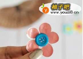 44.在白纸上制作2-3种不同颜色的小花。小心地剪出花朵,在花的中心粘上纽扣。从绿纸上切下几片叶子。将花朵和叶子粘到绿色雪糕棍上,以制作花朵。