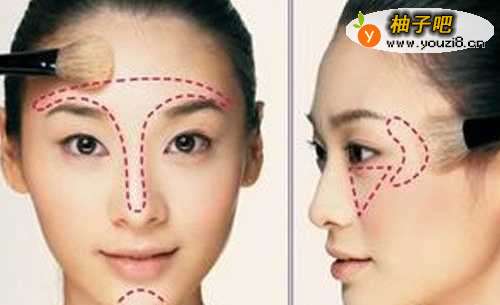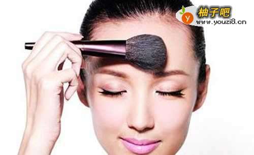 10打阴影。用轮廓刷打阴影,部位是脸部左右两腮处,可以看起来瘦脸的效果,还有就是发际线,也要打一点,如果把头发扎起来,就看起来会显得额头饱满。