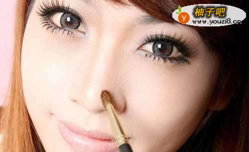 6画鼻影。鼻影可以使你的鼻子更立体泪欧。看起来不会那么塌。鼻影要化鼻子两侧,从眼睛和鼻子的窝一直到鼻翼,注意,不要化太深,要根据你的妆面的浓淡来画。