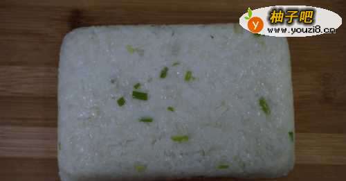 2圆粒糯米与大米混合,放入电饭锅中,加入1:1的纯净水,蒸熟成米饭,打散,加盐,葱花备用。