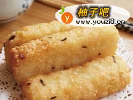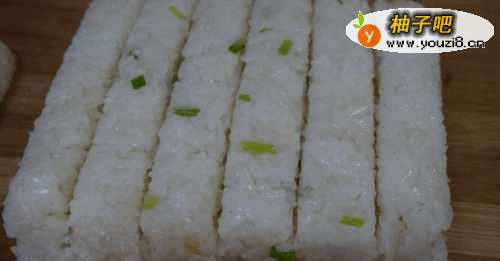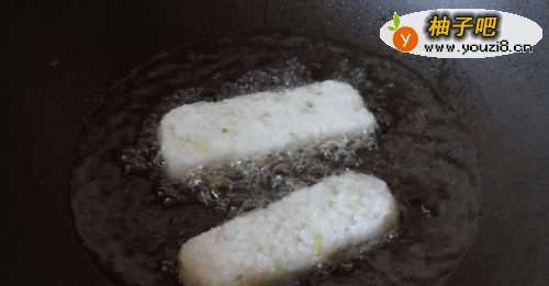 6炸锅内倒入油,大火烧至五成热,放入切好的米糕块炸至金黄色即可。
