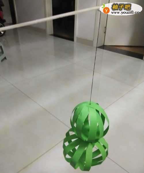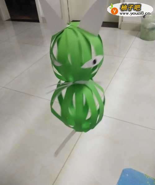 6然后给他做眼睛、胡须和尾巴,用个小棍子连着,哈哈,一个可爱的绿色猫咪就做好啦,怎么感觉绿色这么可爱呢,嘻嘻
