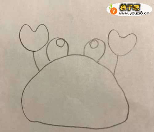 2在大馒头的上方画出2个对称的小弧线,类似耳朵的形状,作为小螃蟹的眼睛,见下图