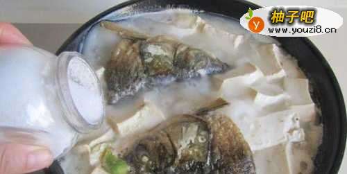 4直到汤色奶白后加入适量的盐和胡椒粉调味,盛入煲中, 撒上小葱末即可;