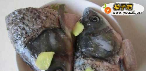 准备好食材,鱼头放入少许盐和料酒涂抹均匀;