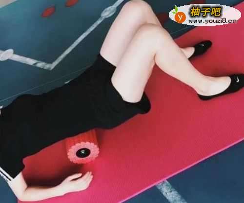 2大腿下侧按摩。瑜伽柱放在大腿下部。大腿前后来回移动。速度均匀。可以换腿。