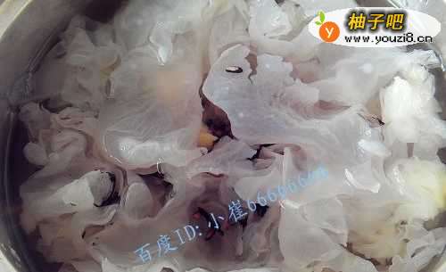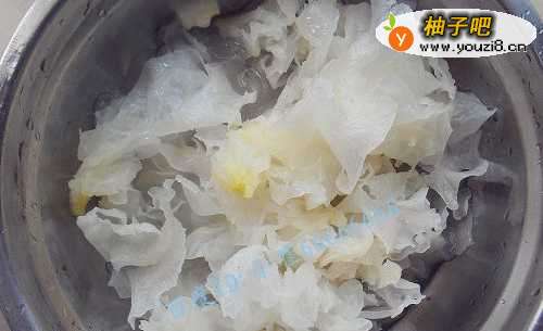 2银耳用温水泡发,撕成小朵,清洗干净。