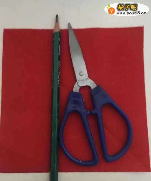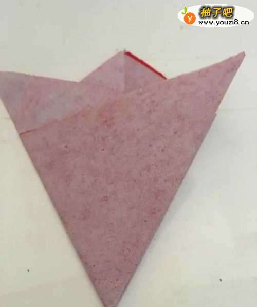第一步 首先把一张16厘米X16厘米的正方形红色彩纸 从下向上对角折叠整齐