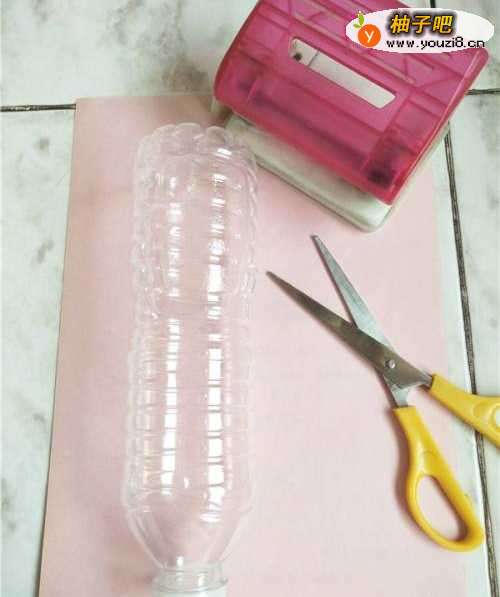 先将饮料瓶洗干净,再准备剪刀和打孔器。