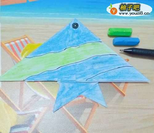 6第六步:用黑色的笔画出鱼的眼睛,鱼画上线条和涂上自己喜欢的颜色,如下图所示。