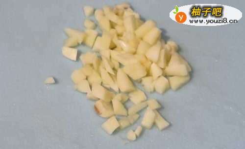 2焯水的间隙可以剥好蒜并切成蒜粒,然后调一个糖醋汁,碗里倒入一勺料酒,两勺生抽,三勺白糖,四勺白醋,然后倒入少量水