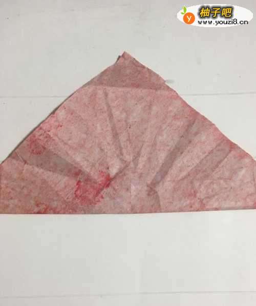 第一步 把一张16厘米X16厘米的正方形红色彩纸 从下向上对角折叠整齐