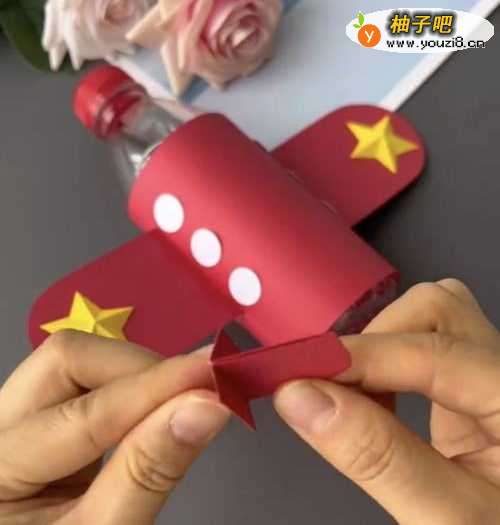 3红色卡纸裁剪出飞机的双翼,相同大小,双面胶固定在飞机两侧。