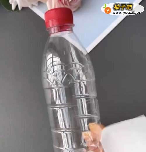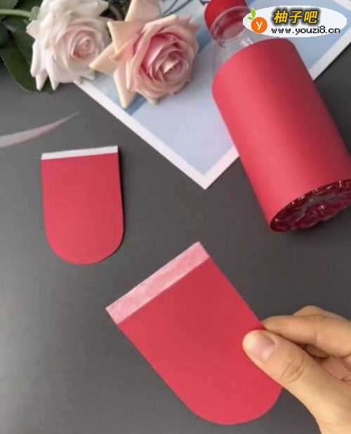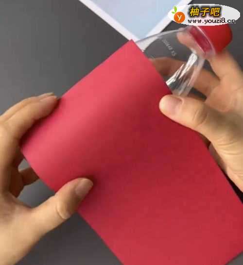 2用双面胶将红色卡纸固定在矿泉水瓶上,如图所示。
