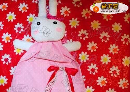 旧毛巾,或是宝宝的旧衣物都可巧妙利用。做个小兔挂袋,粉饰小公主的睡房,很应景吧。害羞的小兔挂在墙上不占地方,还可用来装点小杂物。或是给宝宝当个小玩偶抱抱亲亲:)好看又实用。