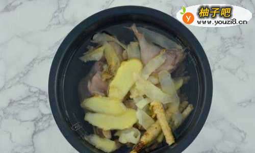 2老鸭切块,洗净去除内脏。生姜洗净切片,玉竹片和沙参洗净。 老鸭出水后洗净,与玉竹、沙参和生姜同时放入锅中,水加到水位线:稠粥1的刻度。 点击开始烹饪