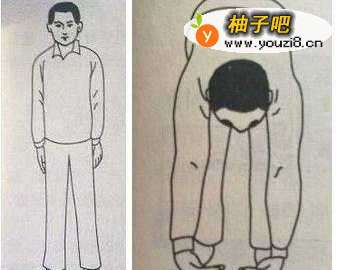 第二,左脚向左跨出一步,两腿分立同肩宽,两手用力抱头后部,手指贴枕后,以两肘用力张开,手指敲小脑后部片刻,然后配合呼吸做屈体动作。吸气时,身体挺起,呼气时,俯身弯腰,头垂至膝间作躬身状,两膝维持挺直,如此反复进行9~20次。第三,缓缓伸腰站起,两手自然下垂。注意弯腰垂头的幅度应因人而异,不可勉强。对患有高血压和脑动脉硬化者不宜。
