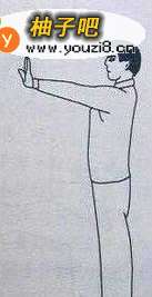 第二,两臂缓缓抬起至前平举位,立掌,掌心向前,手臂伸直。