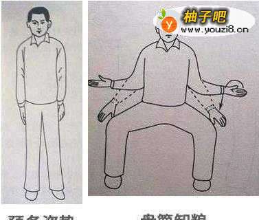 第二,屈臂下压成马步,上体挺直,两肘屈曲,两前臂向前外方水平伸出,掌心向上,如捧重物。以此姿势稍停片刻,两手翻掌向下,虎口向前,如搬放重物,然后两腿慢慢伸直,左脚再收回并拢。做时配合呼吸,捧物时尽量吸气,放物时呼气。注意动作缓慢,沉稳有力,整个过程舌应抵住上颚,微闭口,睁大眼。可做3~5遍。