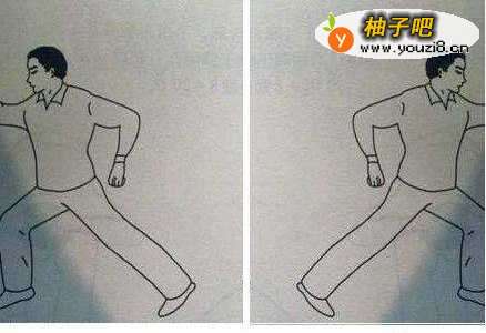 第二,身体向后转,成左弓步,左手握拳前举,右拳斜垂背后,再呼吸5~10次,动作要领同第一。注意意念集中的手部,两臂用力,呼吸时小腹自然放松。可反复练习3~5遍。