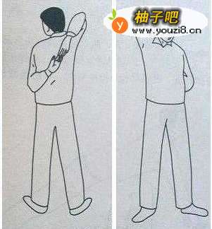 第一,右脚向前跨进一大步,两脚开立,与肩同宽。左手由腋下向后屈,手背紧贴胸椎,指尖尽量向上;右手由右肩后伸,如拉牵绳一样去拉左手手指;足趾扒地,身体前倾。以此姿势呼吸5~10次,每当吸气时两手紧拉,呼气时放松。