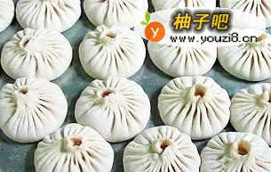 4左手托皮,右手拨入馅15克,掐褶15~16个。掐包时拇指往前走,拇指与食指同时将褶捻开,收口时要按好,不开口,不拥顶,包子口上没有面疙瘩