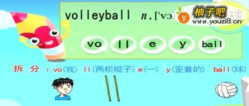 趣味记忆:我(vo)用两根棍子(ll)把一(e)个歪着的(y)球(ball)拨正了,一看,是个排球(volleyball)。