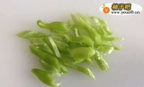 2再准备一个青辣椒,切成条备用。