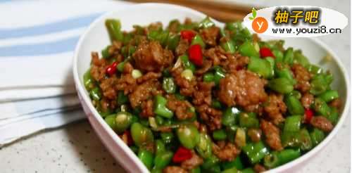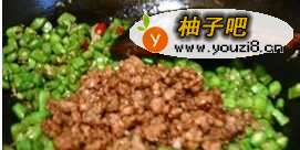 8豆角成熟之后 加入之前炒好的肉末 加适量的盐 翻炒均匀