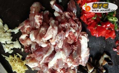 鸭肉要切片,茄子去皮后切成小段条并且泡水、这样茄子不会变色,香菇切成丁、辣椒切成丁、姜切成丁、蒜切成丁