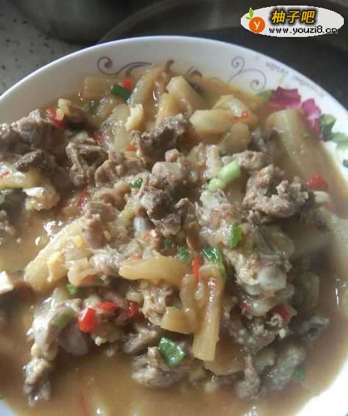 热锅冷油先放鸭肉并且翻炒一下,(因为菜籽油可以去腥味,所以一定要先放菜籽油),但是不要翻炒太久,如果翻炒太久了,鸭肉会很老,所以只要鸭肉变色后就可以放凉水,因为茄子也有水分,所以可以稍稍少放一点,然后盖上锅盖,这样鸭肉会很嫩很嫩,再等待5分钟就好