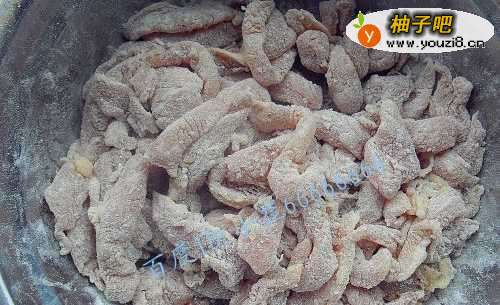 4腌好的鸡柳表面沾满淀粉和面粉的混合物,小编这次的淀粉和面粉比为2:1