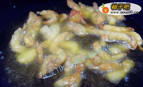 5锅里倒入适量的花生油烧开,将鸡柳放进锅里。
