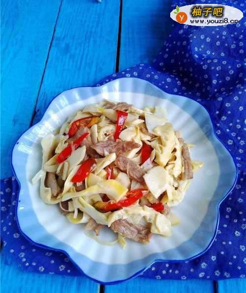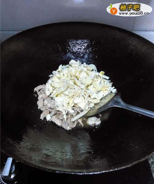7肉丝炒变色后,放入笋子,继续翻炒。