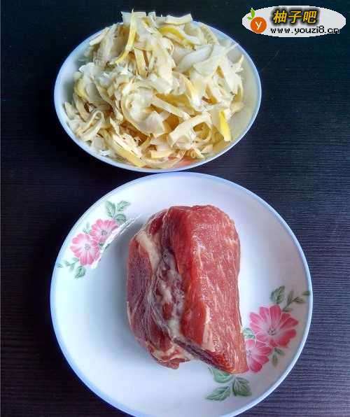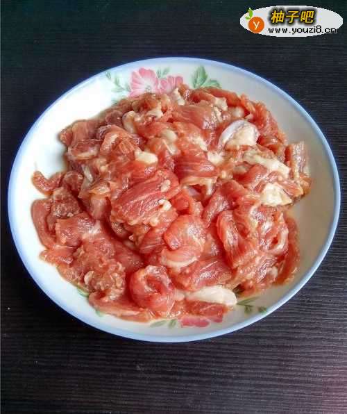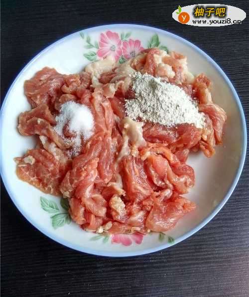 2猪肉洗净切成肉丝,调入适量盐,淀粉。
