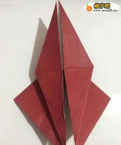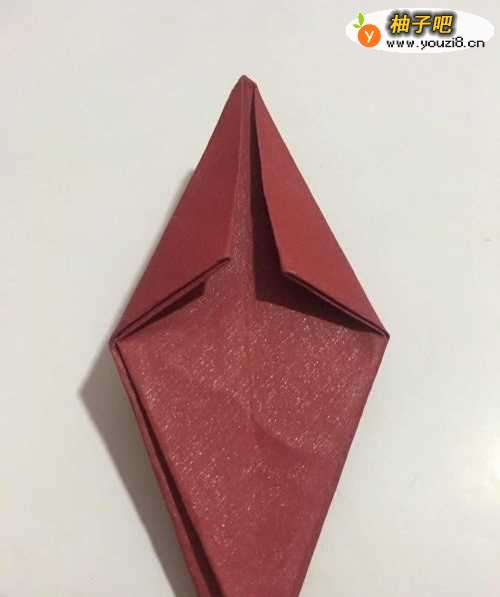 6第六步 折完翅膀之后 把上面的尖角向下搓折出猫头鹰的头部和鼻子 下边角向上折叠一小部分 然后再画上猫头鹰的眼睛就行了
