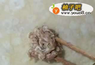 2把搅拌均匀的肉末放在面饼上面,大约占四分之一的地方就可以