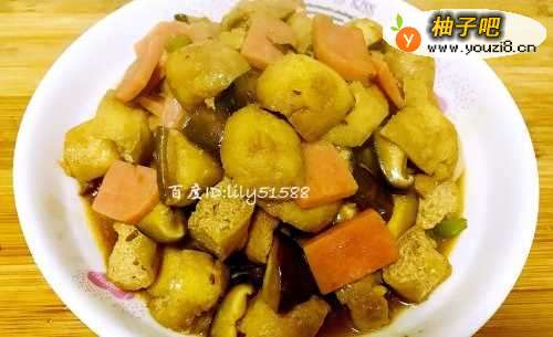 8油豆腐香菇炒火腿肠就做好了,装盘上桌开吃了。