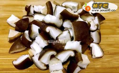 2将香菇的根部掰掉,用清水洗干净,切成大块备用。
