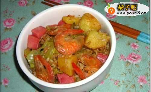 2咸饭里搭配上甘兰、土豆、豌豆还有肉,香肠可以换成鸡肉营养会更好,里面有丰富的维生素和蛋白质,即可以增加主食的多样性,足量的蔬菜,又有浓郁的口感。甘兰土豆鲜虾焖咸饭可以说营养丰富,对糖尿病人来说是很合适的。