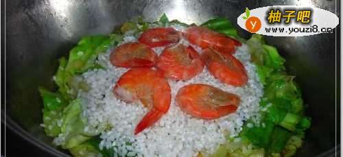 最后铺上事先浸泡好的大米。把虾干放到上面。添上适量的水。水量比平时焖饭的水量要稍少一点。