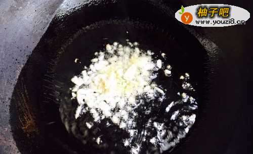 4接下来就是炒制肥肠了,首先将锅烧热之后加入少许油,油热之后把姜蒜末倒进去煸香,然后把非常短倒进去翻炒,待肥肠的油脂全部被煸出即可!