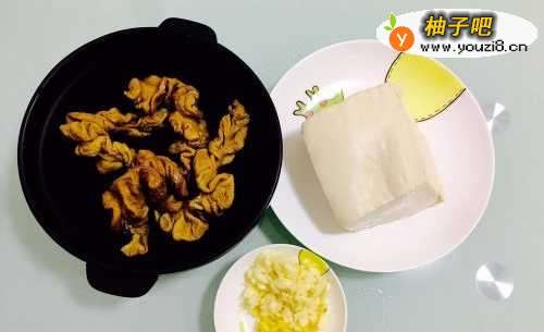 这道肥肠豆腐煲我选择的是卤煮肥肠,非常本身已经是熟的,省了很多清洗的时间,选择嫩豆腐,将姜蒜切成末备用!