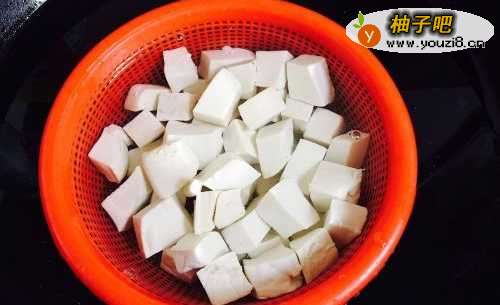 3接着把煮好的豆腐块用冷水稍微泡一会,然后放在篮子里沥干水分备用。