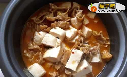 7紧接着就是把肥肠豆腐煲倒在炖锅中,炖煮20分钟左右,待豆腐都入味后即可起锅。