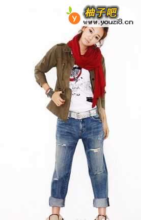短袖衫搭配深色的牛仔外套本来就看起来显瘦了,宽松随意的牛仔裤更是可以将腿部的肉肉隐藏起来,搭配上红色的围巾显得特别的喜庆,同时又带着一丝俏皮的感觉,很不错哦。