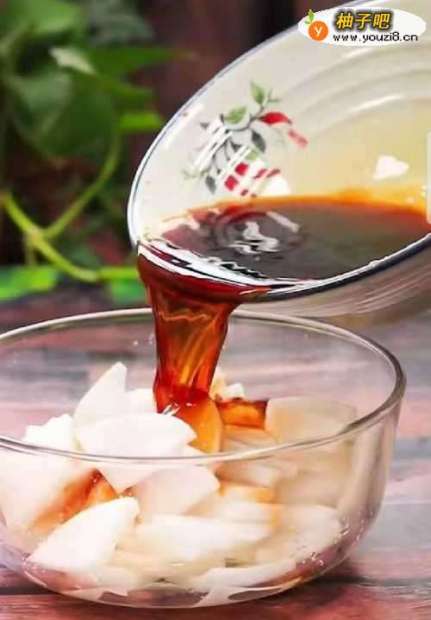 3将盐水倒掉,加入调好的碗汁(白醋3勺,生抽5勺,白糖2勺,水半酱露碗)